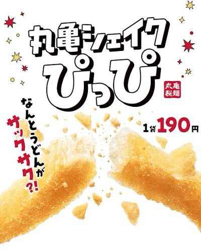 - 丸亀シェイクぴっぴ::うどんの麺を揚げた、サクサクとした食感のスナック菓子です。