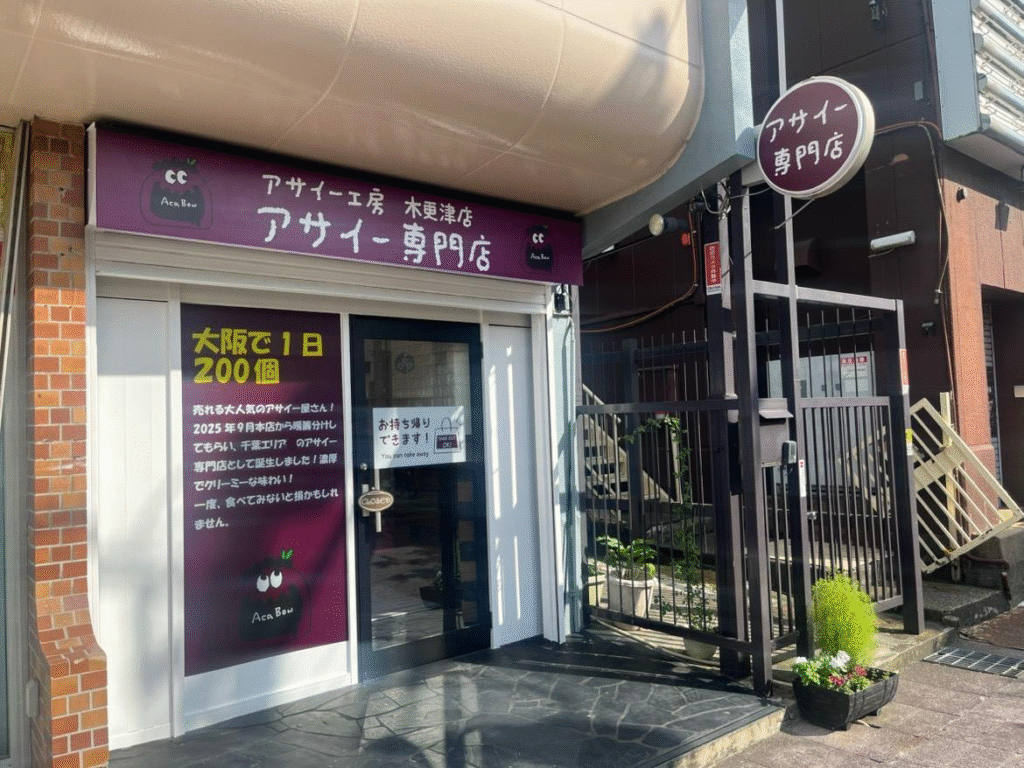 木更津駅東口(太田山口)から徒歩1分。駅の階段を左手から降りるとすぐ見える、紫色の看板が目印のお店。こちらは「アサイー工房木更津店」。今大注目のお店が、本日2025年9月18日(水)にオープンします!テイクアウトはもちろん、イートインもできますよ。店内にはイートイン用のスペースもあります。