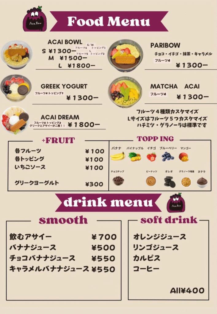 メニューも豊富で、ノーマルの「ACAI BOWL(アサイーボウル)」はS・M・Lの3種類のサイズがあり、SとMサイズならフルーツ4種類トッピング1種類を選ぶシステム。Lサイズだとフルーツ5種類とトッピング2種類に増えます。